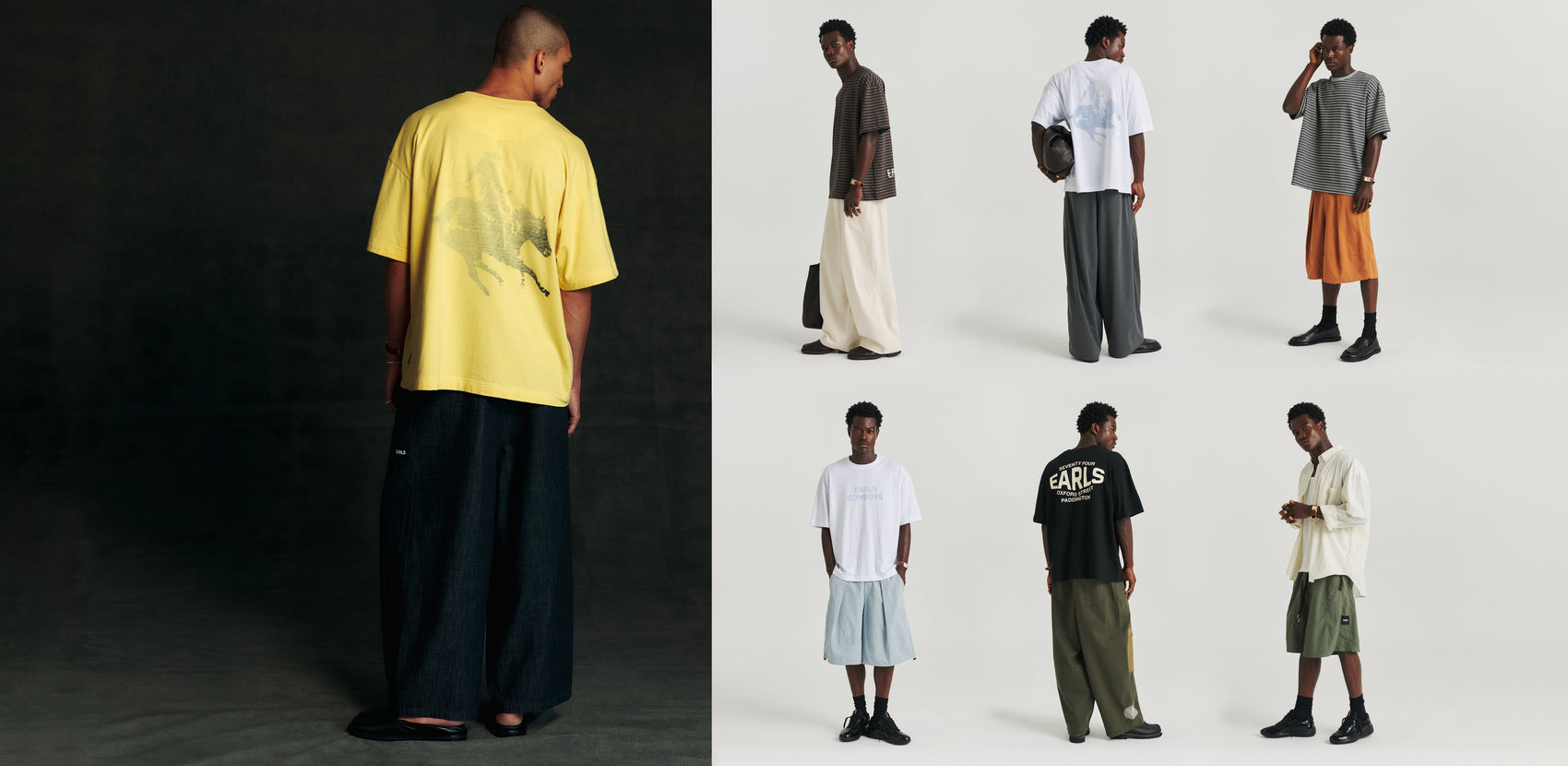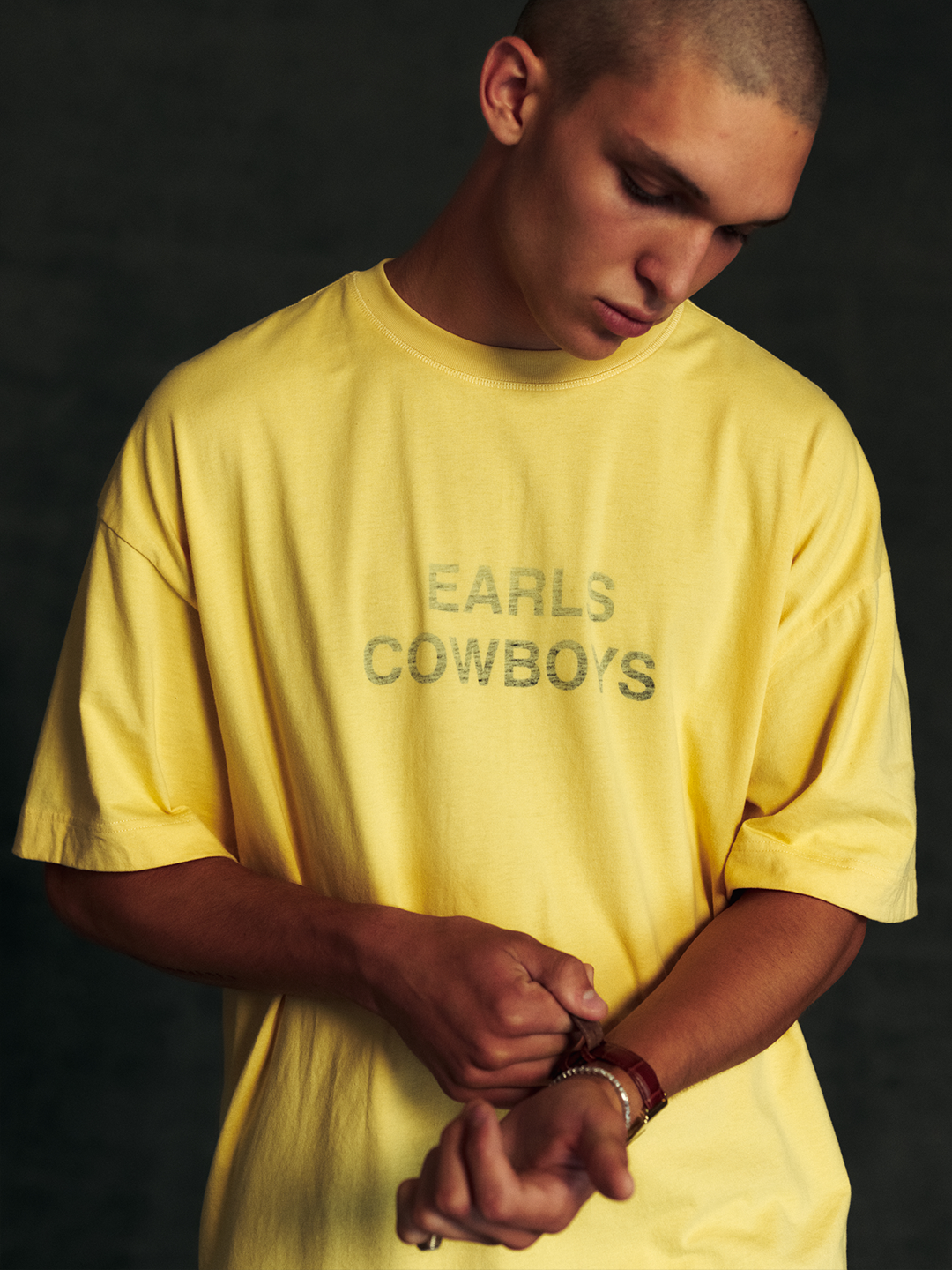 The Cowboys Tee is a lightweight take on a boxy, slightly cropped silhouette. Crafted from 160gsm cotton, it’s designed for breathability with a soft, relaxed hand feel. Screen printing is applied to the reverse and intended to show through the fabric, creating a subtle, worn-in graphic effect. Overlocked seams and a slightly contrasting neck rib add understated character, while earls westernwearsize labelling and a pip label at the wearer’s left side seam finish the piece with considered detail.