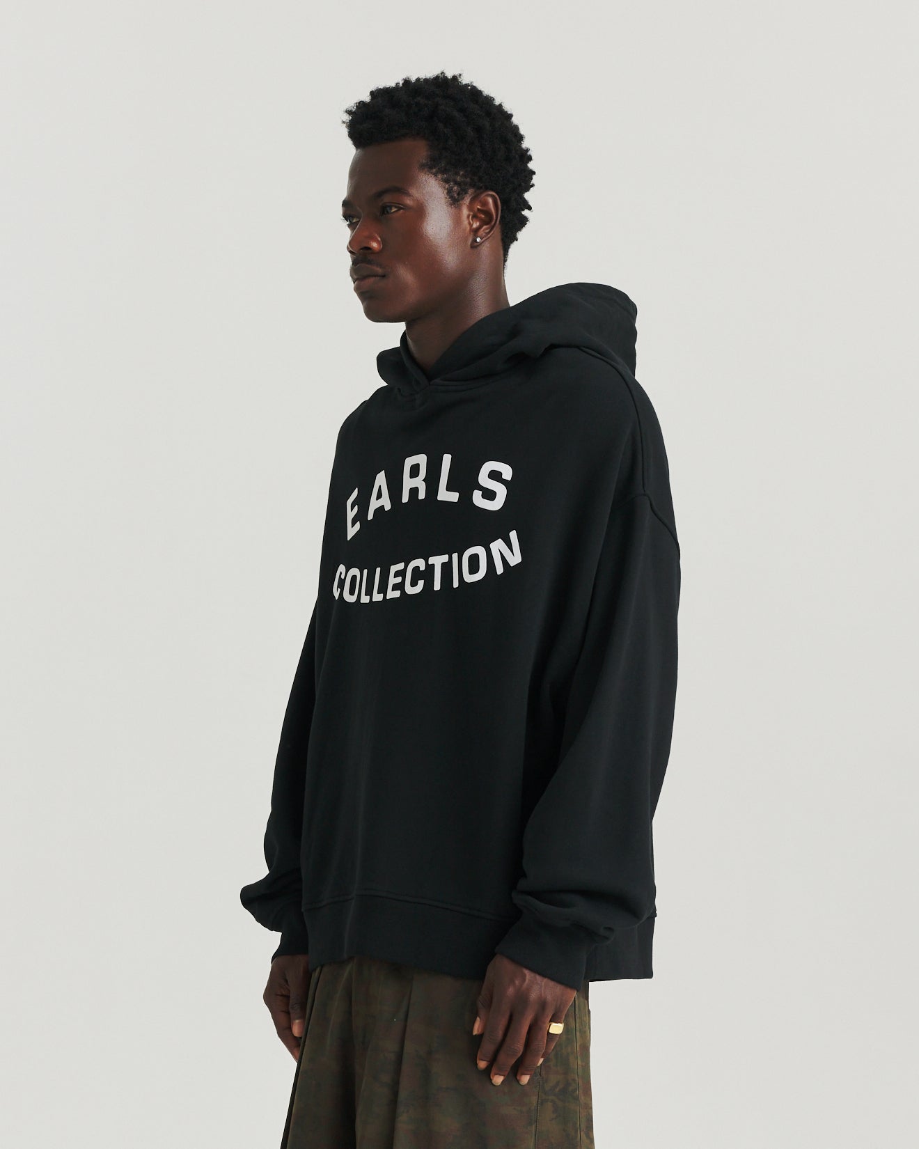 The Flock Hood is a heavyweight pullover built for warmth and everyday comfort. Crafted from dense 420gsm cotton terry, it features a raised flock print reading ‘Earls Collection’ across the front chest. The relaxed, oversized fit channels vintage athletic wear, while the flock detailing and heavy construction lend a lived-in authenticity. Designed as a modern essential with a sporting sensibility.