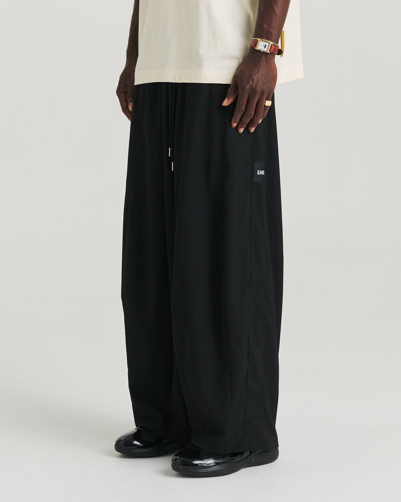 The Relax Pant is an exaggerated wide-leg silhouette built for effortless wear and fluid movement. Designed with an elasticated waistband and internal drawcords, it offers an adaptable fit that complements its relaxed drape. Rounded pockets add a soft, utilitarian edge, while an 'Earls' patch at the side leg and subtle dart detailing provide elevated finishing touches. Crafted from a smooth, stretch-infused fabric, this pant combines structure with all-day comfort.