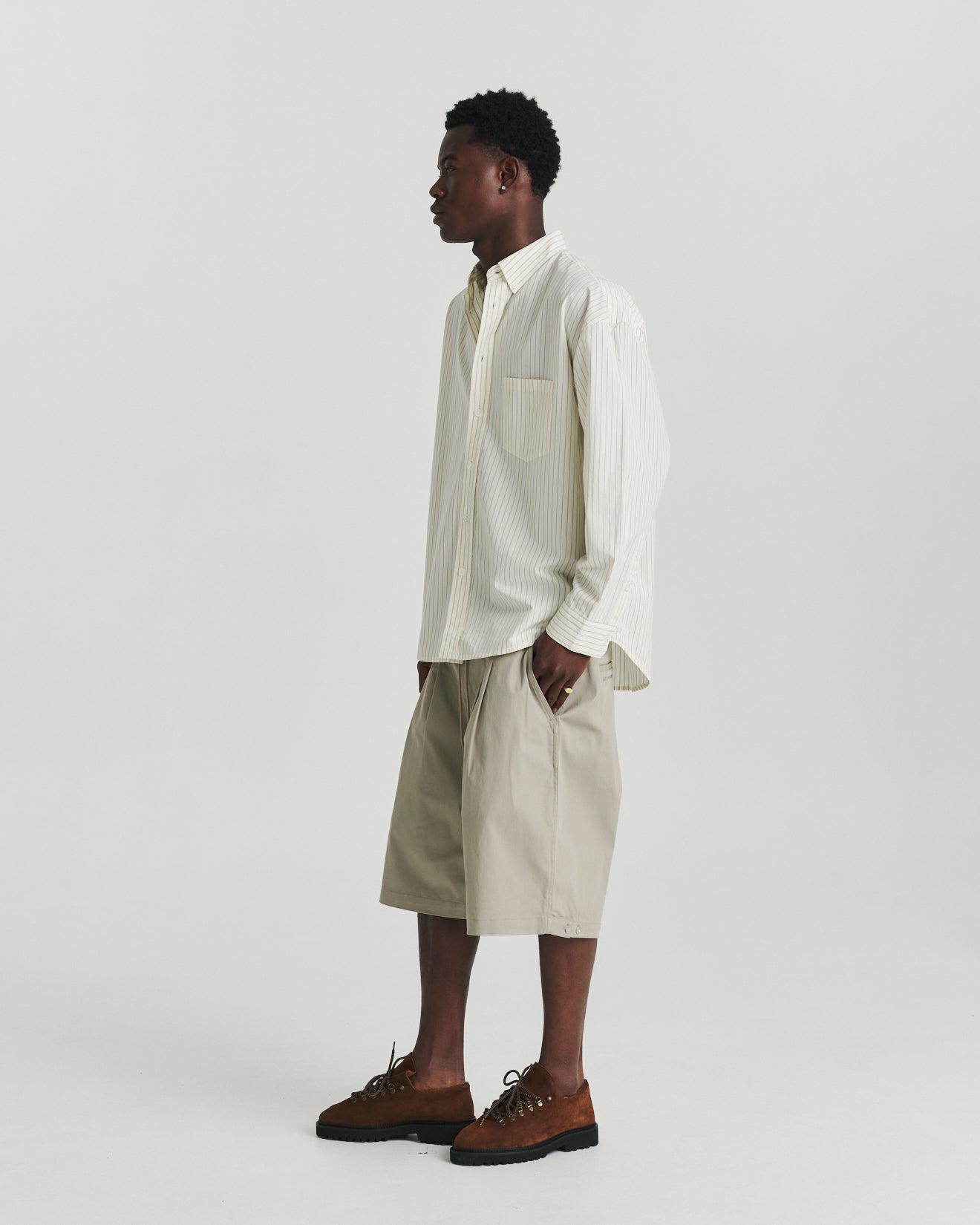 Effortless Volume, Elevated Fabrication. The Globo Short is an oversized, adjustable balloon-leg short crafted from an ultra-premium European cotton-elastane blend. Woven in some of the world’s finest mills from superfine yarn, the fabric delivers unparalleled performance and luxury—softening and improving over time with proper care. Designed for both structure and fluidity, the short features a fixed waistband with adjustable drawcords and is finished with branded silver hardware at the aglets, eyelets, and buttons.