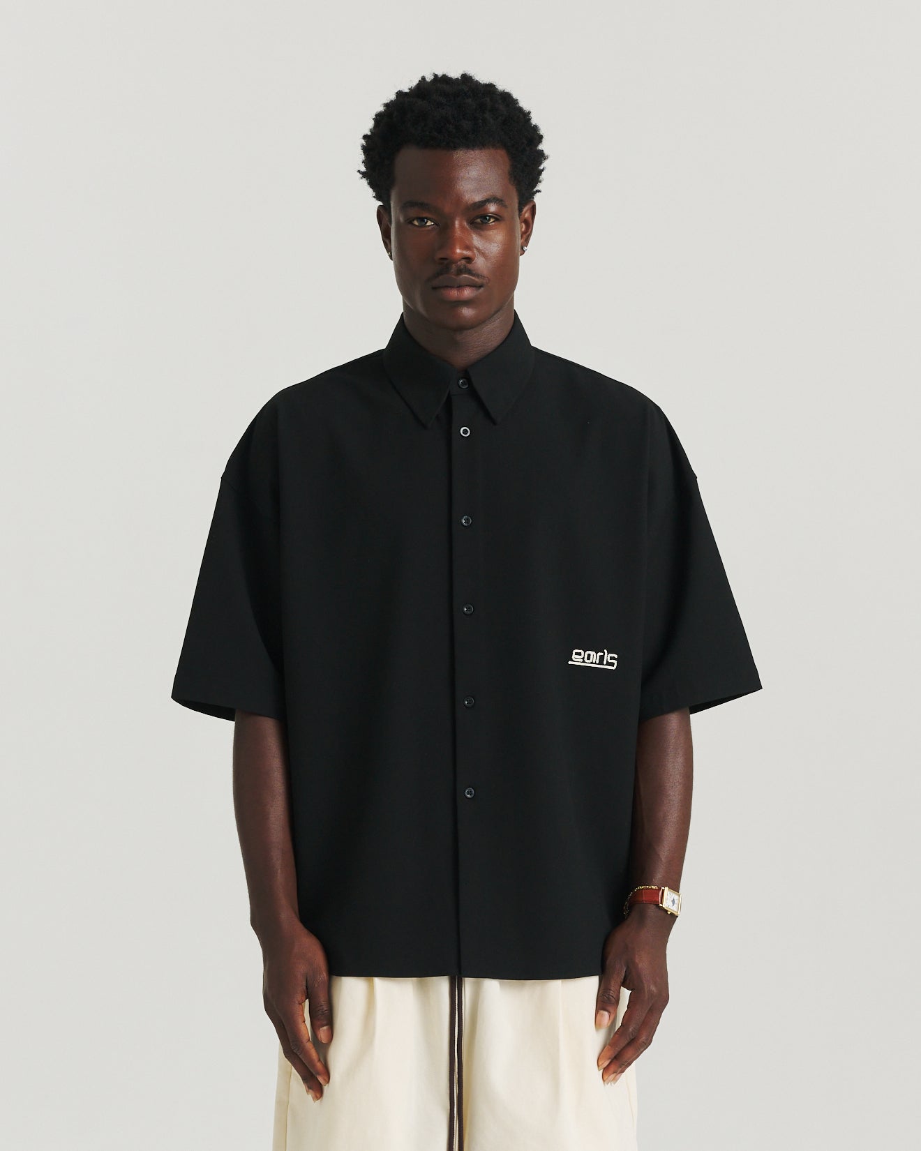 A refined staple with a utilitarian edge, the Relax Shirt is crafted from a heavyweight polyester-rayon blend for a soft yet structured feel. Designed with a short-sleeve button-up silhouette and finished with a small EARLS embroidery at the lower left chest, this piece offers understated sophistication and everyday versatility.