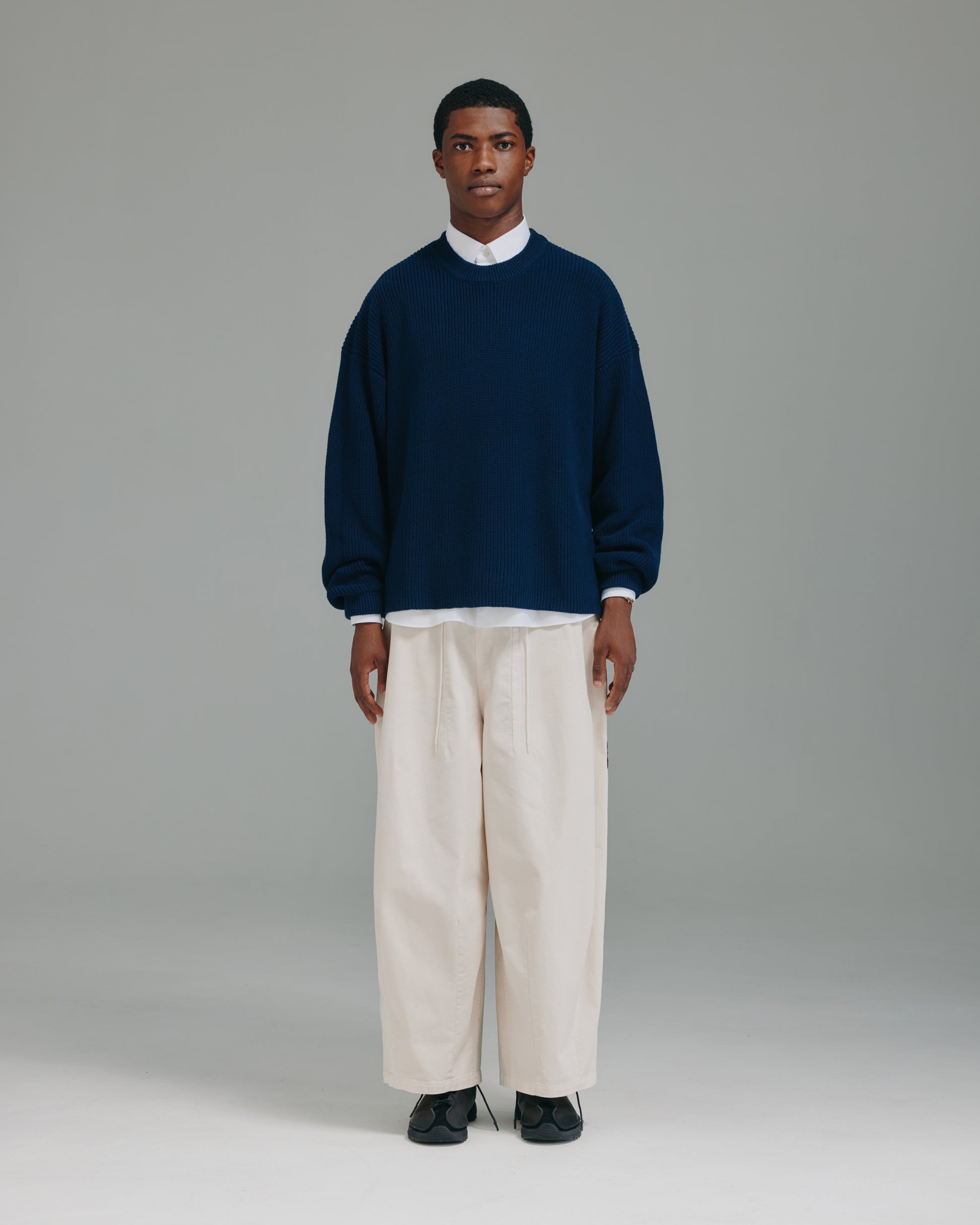 The Sleek Knit is built from 100% cotton yarn, shaped through a compact knit construction for a considered, structured feel. Its compact construction holds a sharp, understated silhouette, balanced by a raw hem that softens the finish with a worn-in edge. A refined embroidered detail at the lower back adds a quiet signature. Designed to sit effortlessly within rotation, it bridges everyday wear with a more elevated sensibility.